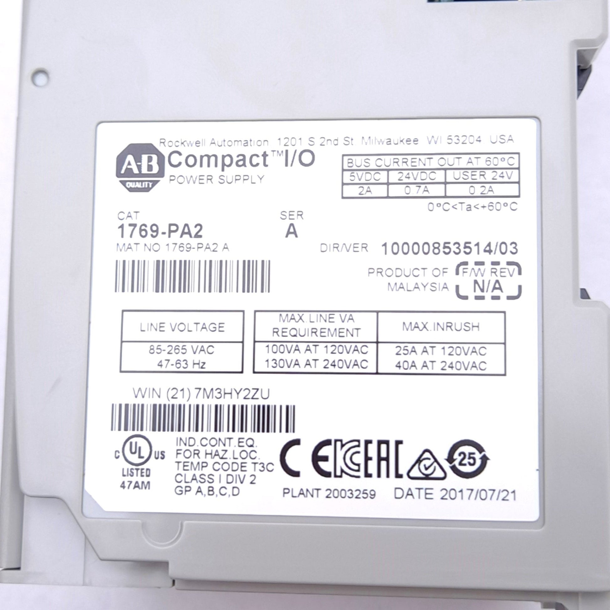 Used Allen Bradley 1769-PA2 A CompactLogix Power Supply, 120/240VAC In, 5/24VDC Out