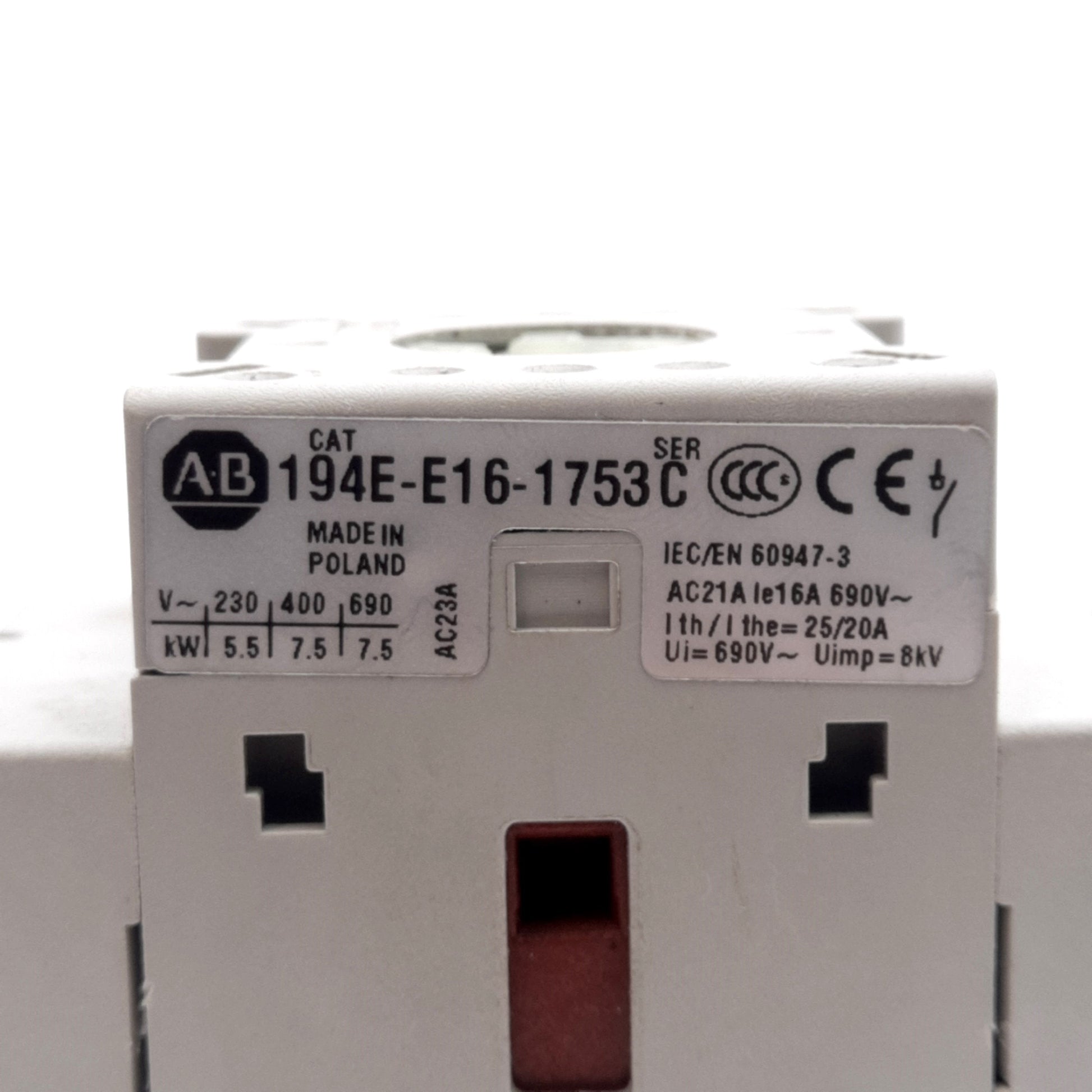 | Item Condition: Used SKU: SB-189366 ST12-1-K From our inventory we are selling a Allen Bradley 194E-E16-1753 Disconnect Switch, 3-Pole, 600VAC 16A, DIN Rail. Specifications: