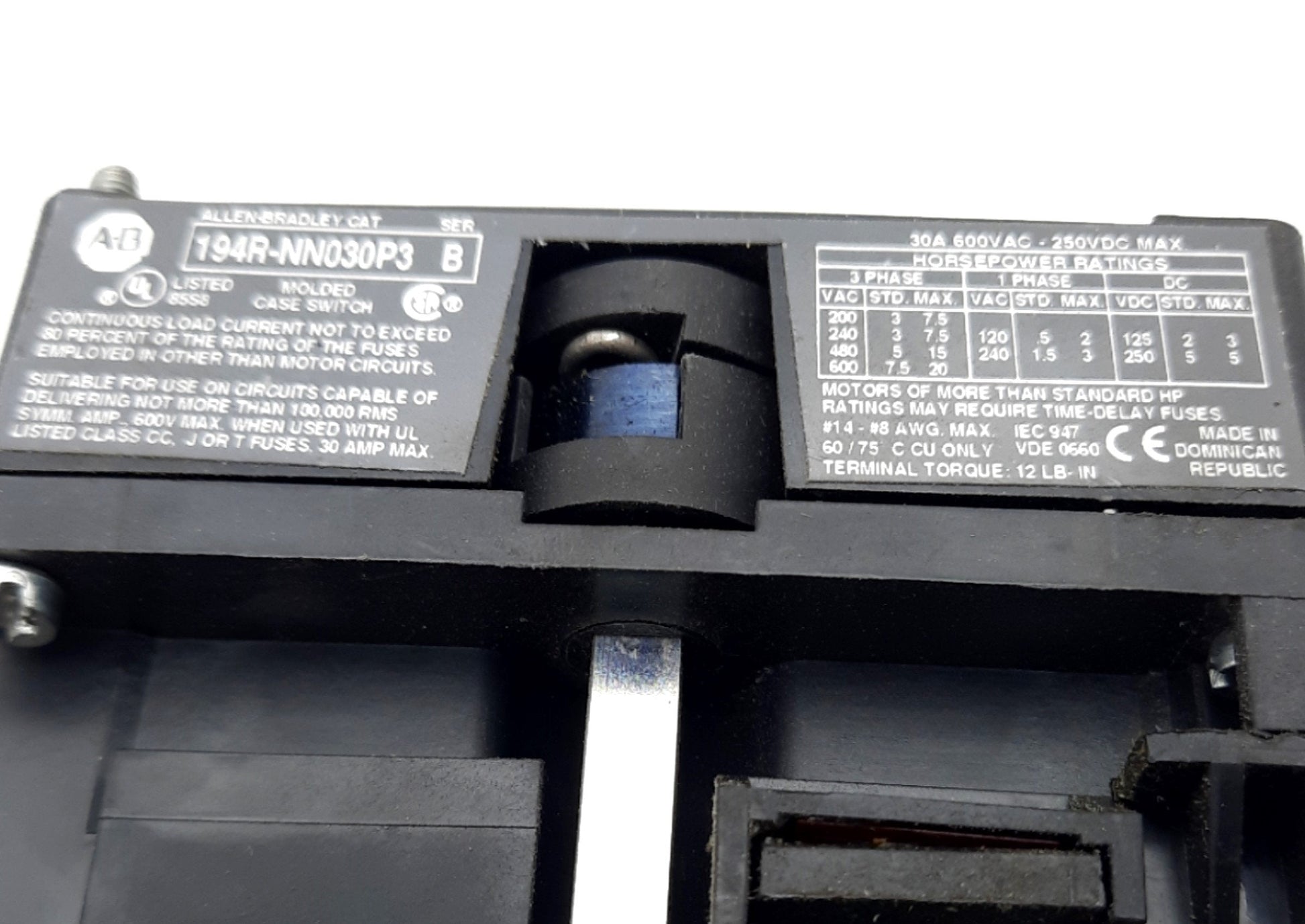 Used Allen Bradley 194R-NN030P3 Disconnect Switch, 3-Pole, Rating: 30A 600VAC 250VDC