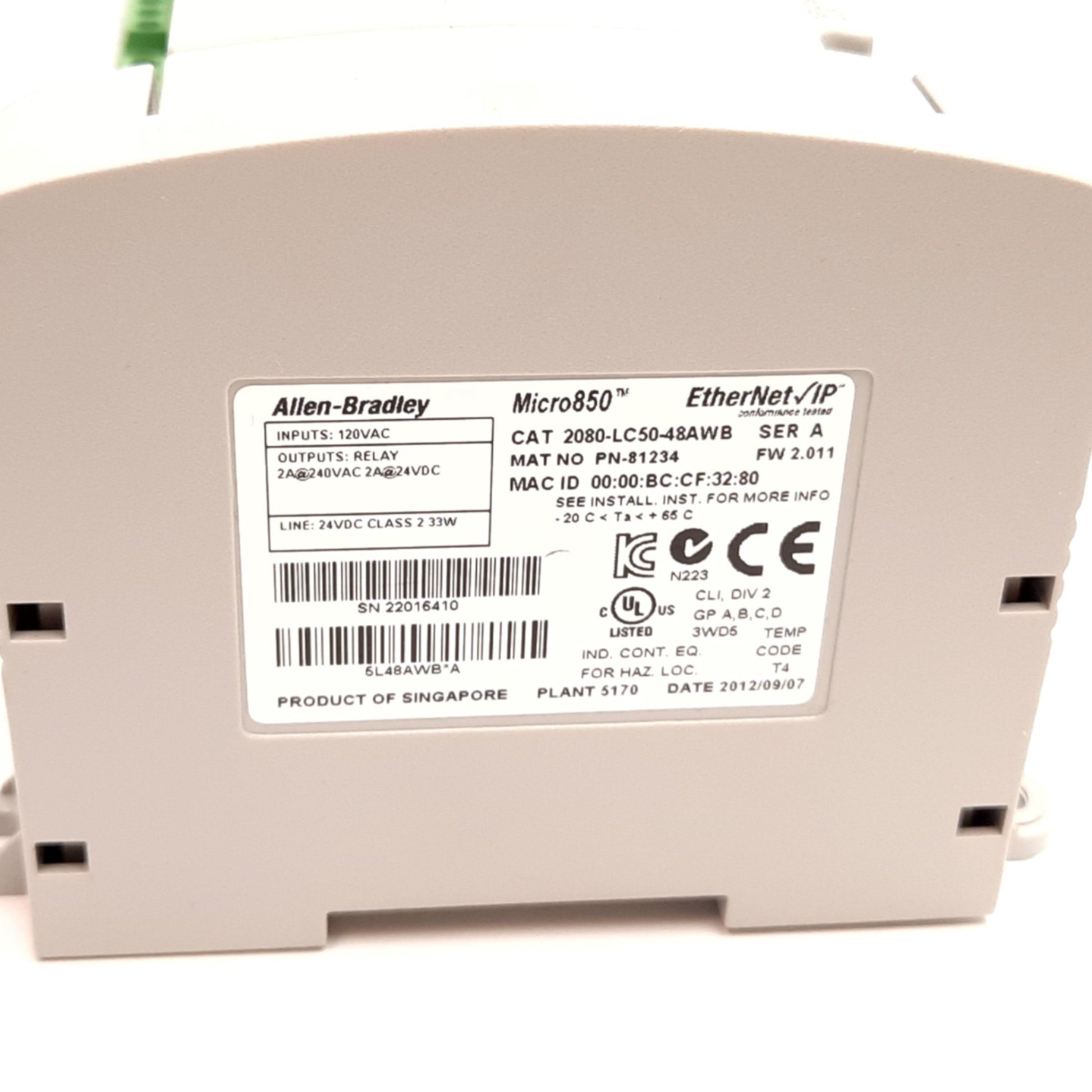 Used Allen Bradley 2080-LC50-48AWB Micro850 I/O EtherNet/IP Controller, 5-Slot