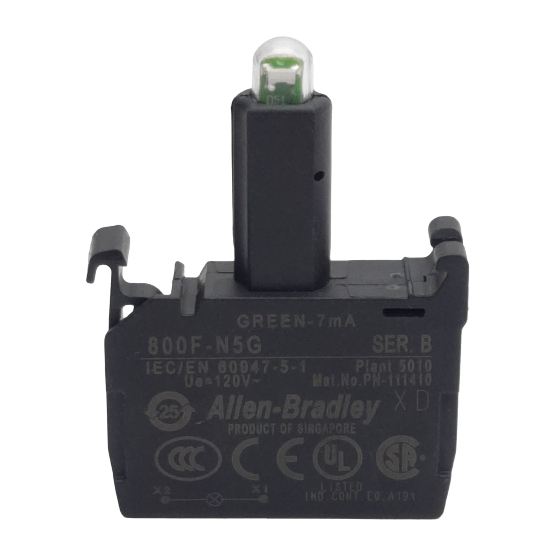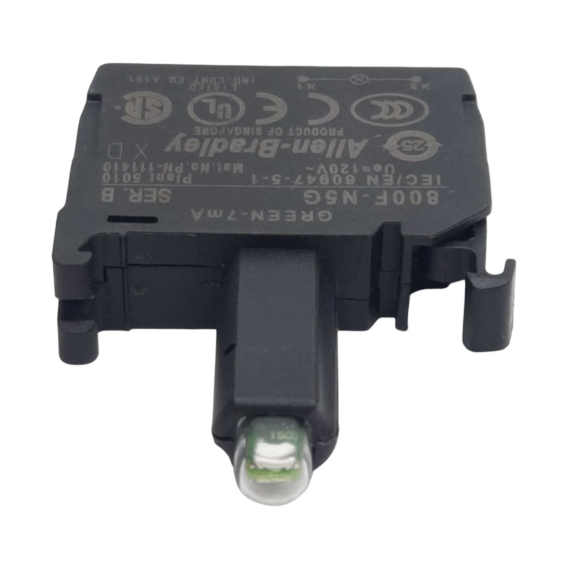 | Item Condition: Used SKU: SB-204072 ST26-1-B From our inventory we are selling a Allen Bradley 800F-N5G Pushbutton LED Module Green 7mA 120VAC, 22mm, Latch Mount. Specifications: