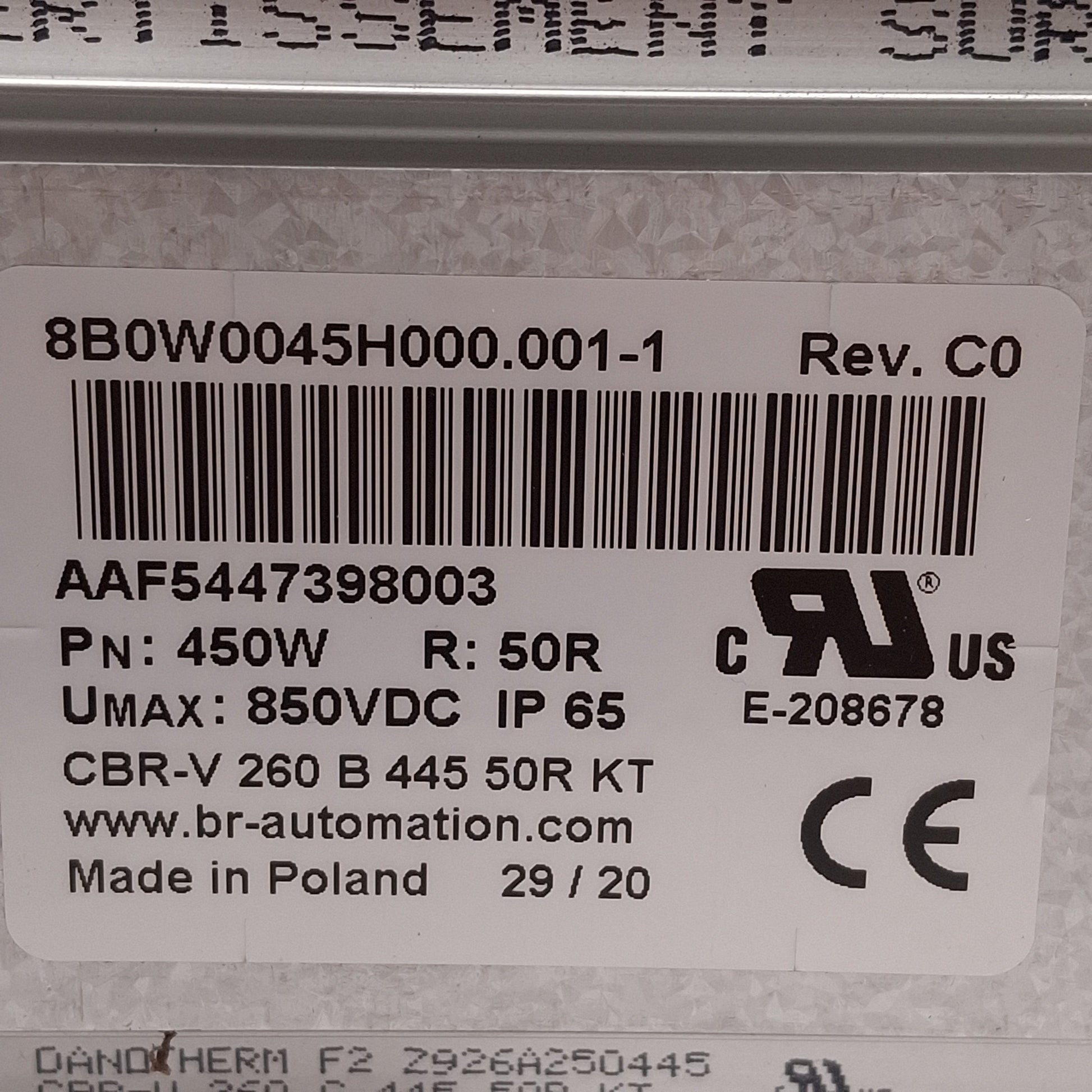 From our inventory we are selling a B&R 8B0W0045H000.001-1 Intrinsically Safe Braking Resistor, 450W, 50 Ohms, 850VDC.