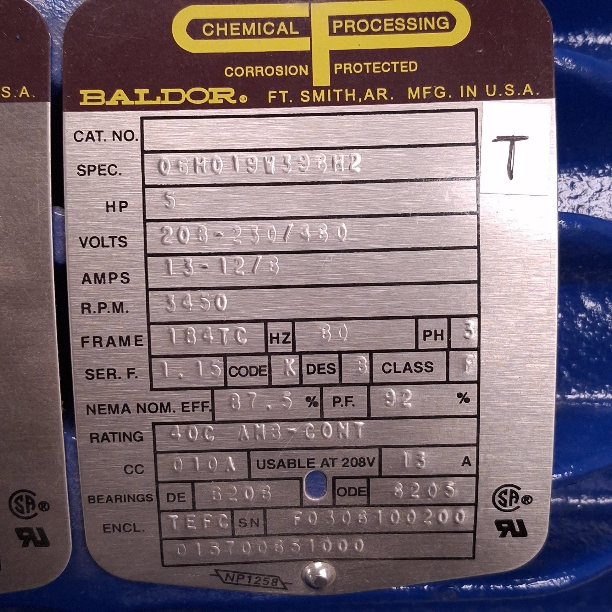| Item Condition: Used SKU: SB-200291 PQ-4-A From our inventory we are selling a Baldor 06H019W396H2 Marine Duty Motor, 3Ø 208-230/460VAC, 5HP, 3450RPM, 184TC. Specifications: