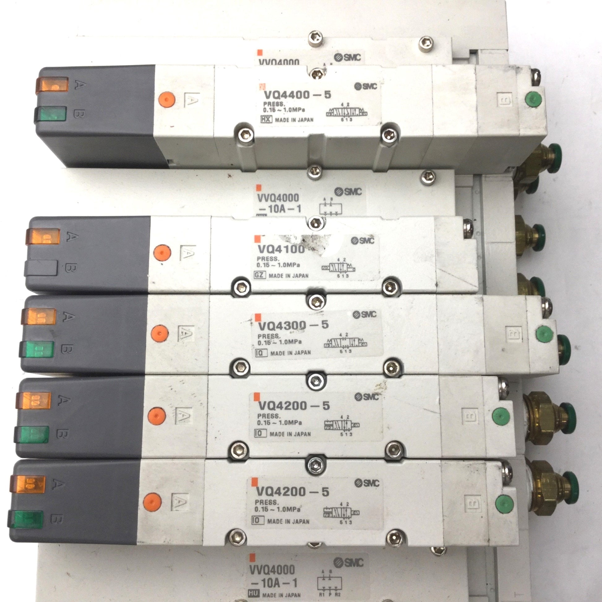 | Item Condition: Used SKU: SB-140983 NB-1-B From our inventory we are selling a Bank of 5 SMC 1x VQ4100-5, 2x VQ4200-5, 1x VQ4300-5, 1x VQ4400-5 Solenoid Valves. Specifications: