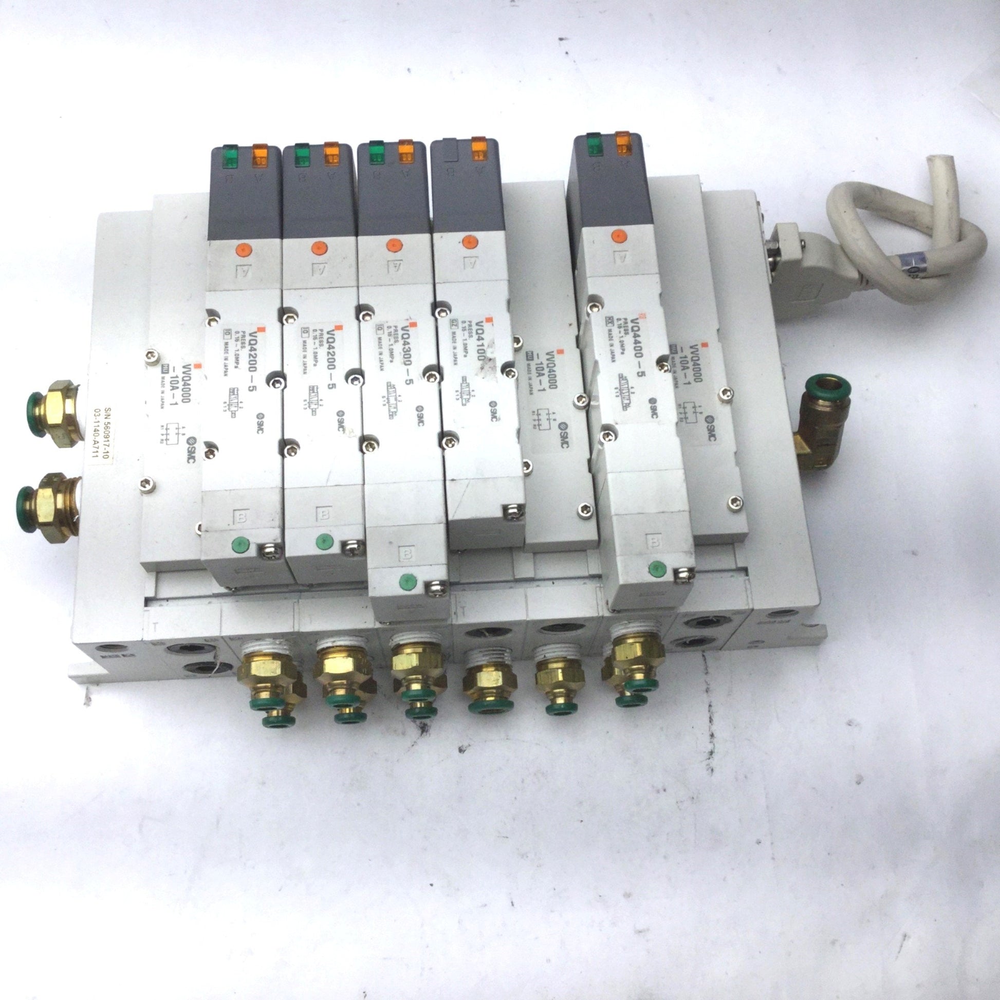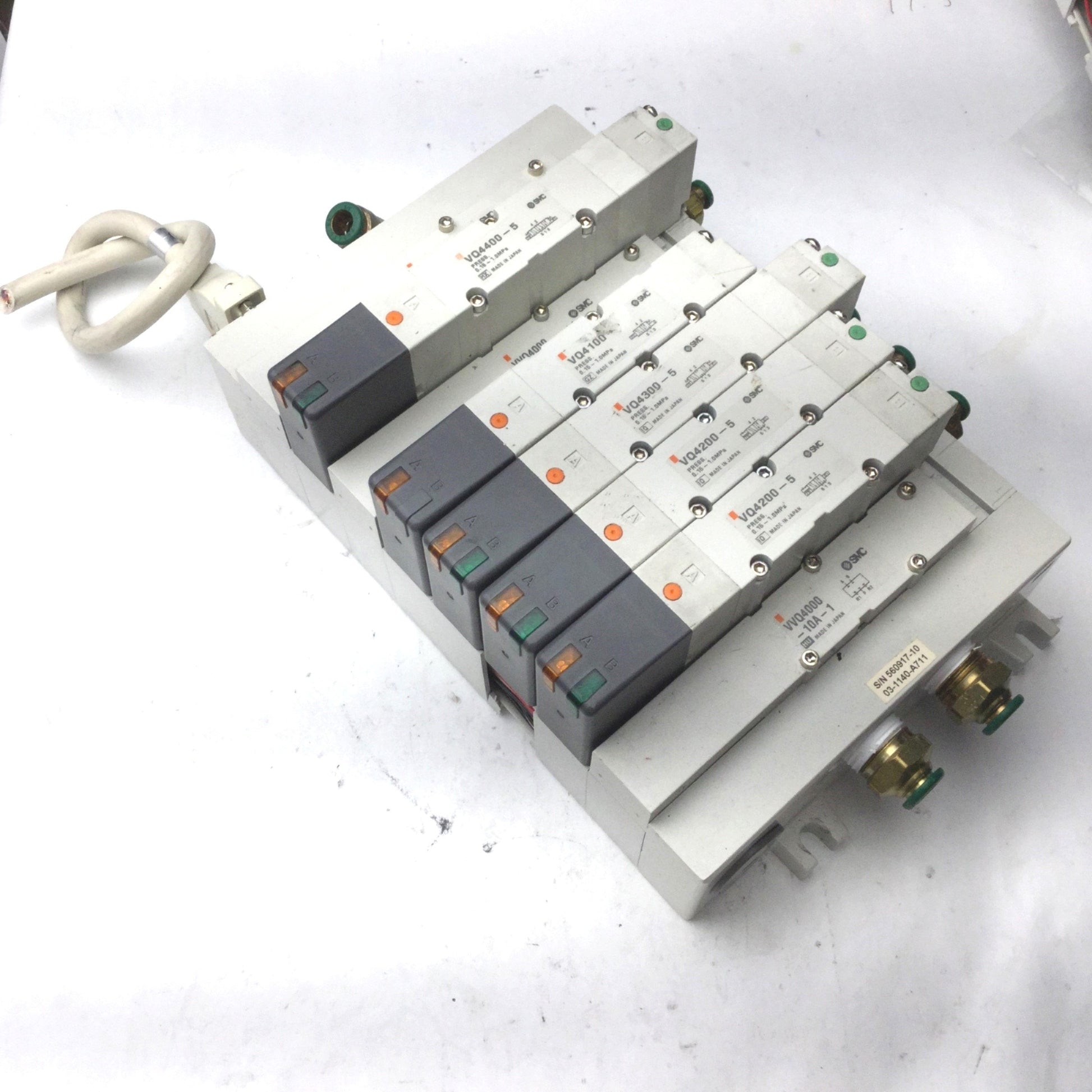 Used Bank of 5 SMC 1x VQ4100-5, 2x VQ4200-5, 1x VQ4300-5, 1x VQ4400-5 Solenoid Valves