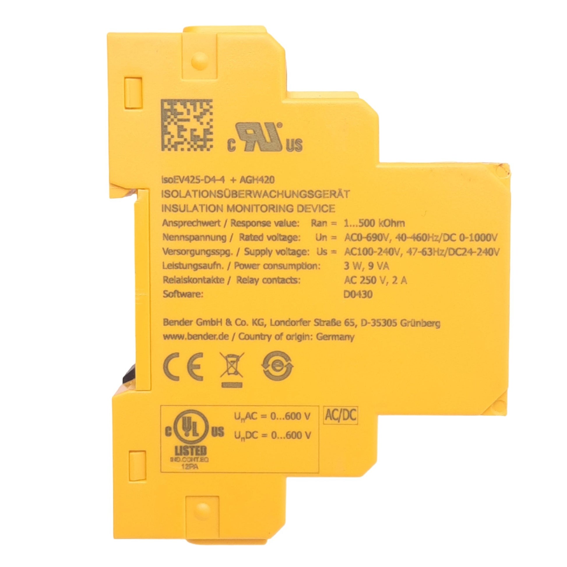 Used Bender isoEV425-D4-4 ISOMETER Insulation Monitoring Device, 100-240VAC/24-240VDC