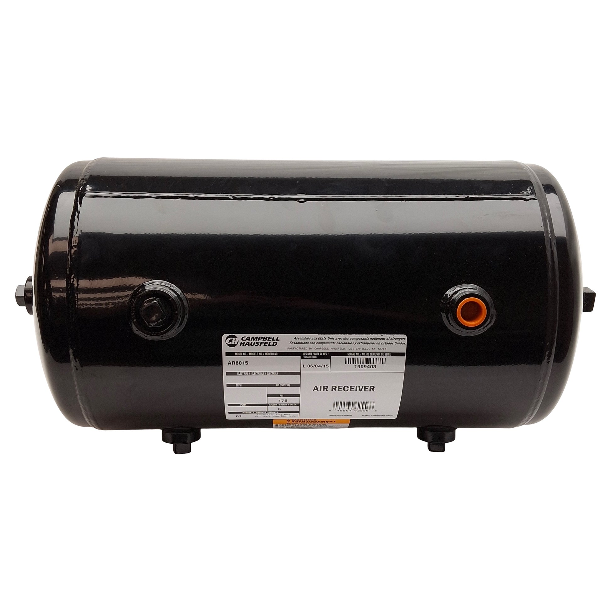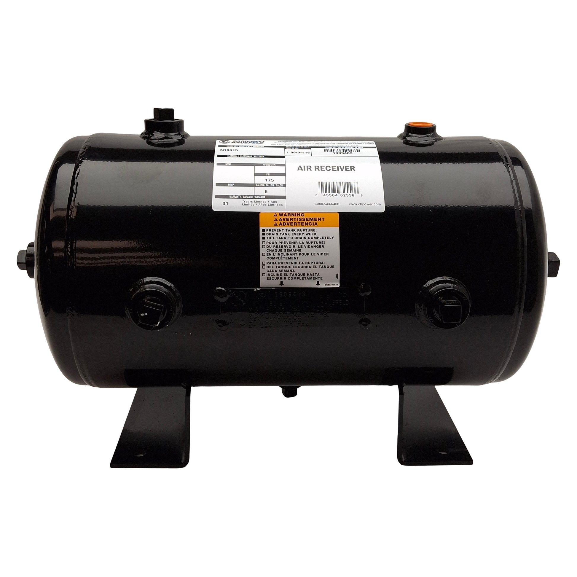 Used Campbell AR8015 Air Receiver Surge Tank, 6 Gallon, 175PSI, 1/2" 3/4" & 1" NPT