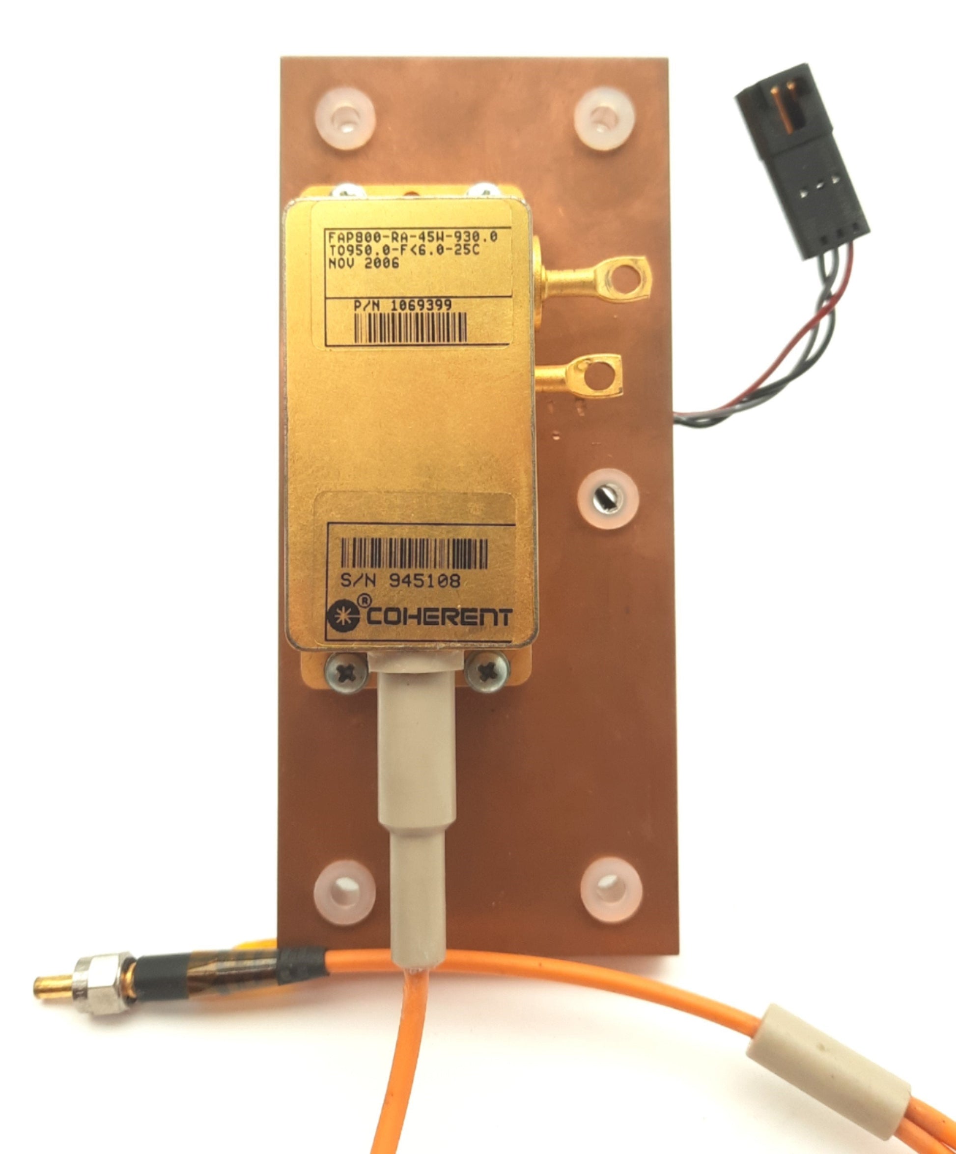 From our inventory we are selling a Coherent 1069399 FAP LASER Diode, 45W, 930-950nm Wavelength, <6-25°C.