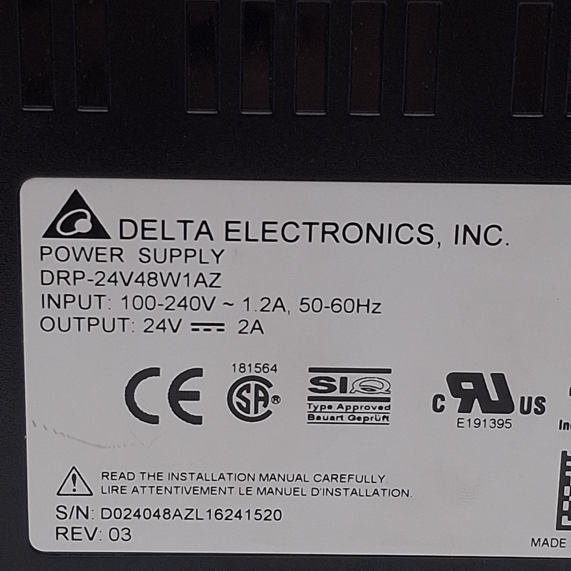 Used Delta Electronics DRP-24V48W1AZ Power Supply, 100-240VAC In, 24VDC 2A Out, 48W