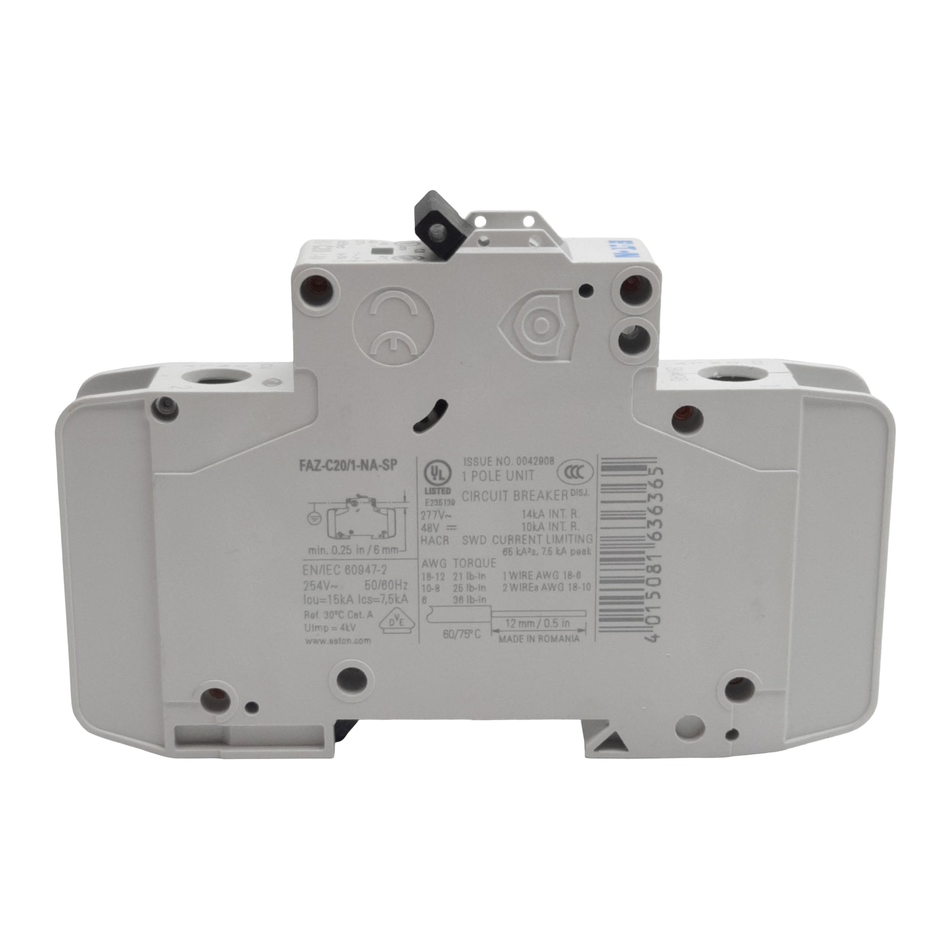 Used Eaton FAZ-C20/1-NA-L-SP Circuit Breaker, 1-Pole, 20A 277VAC/48VDC, DIN Rail