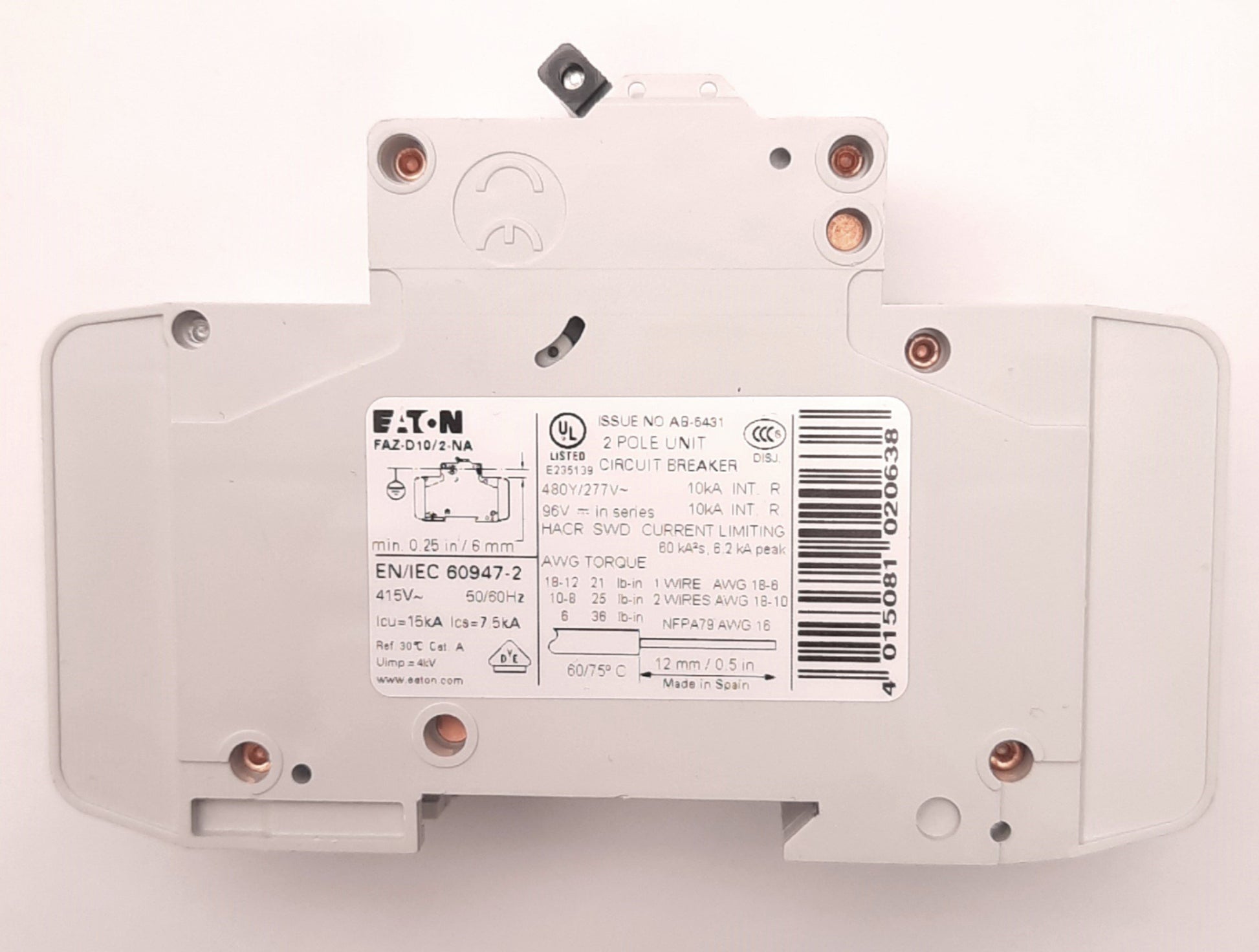 Item Condition: Used SKU: SB-166847 ST40-4-G From our inventory we are selling a Eaton FAZ-D10/2-NA Circuit Breaker Two-Pole, 15A, 415v AC, 60v DC, DIN Mount. Specifications: