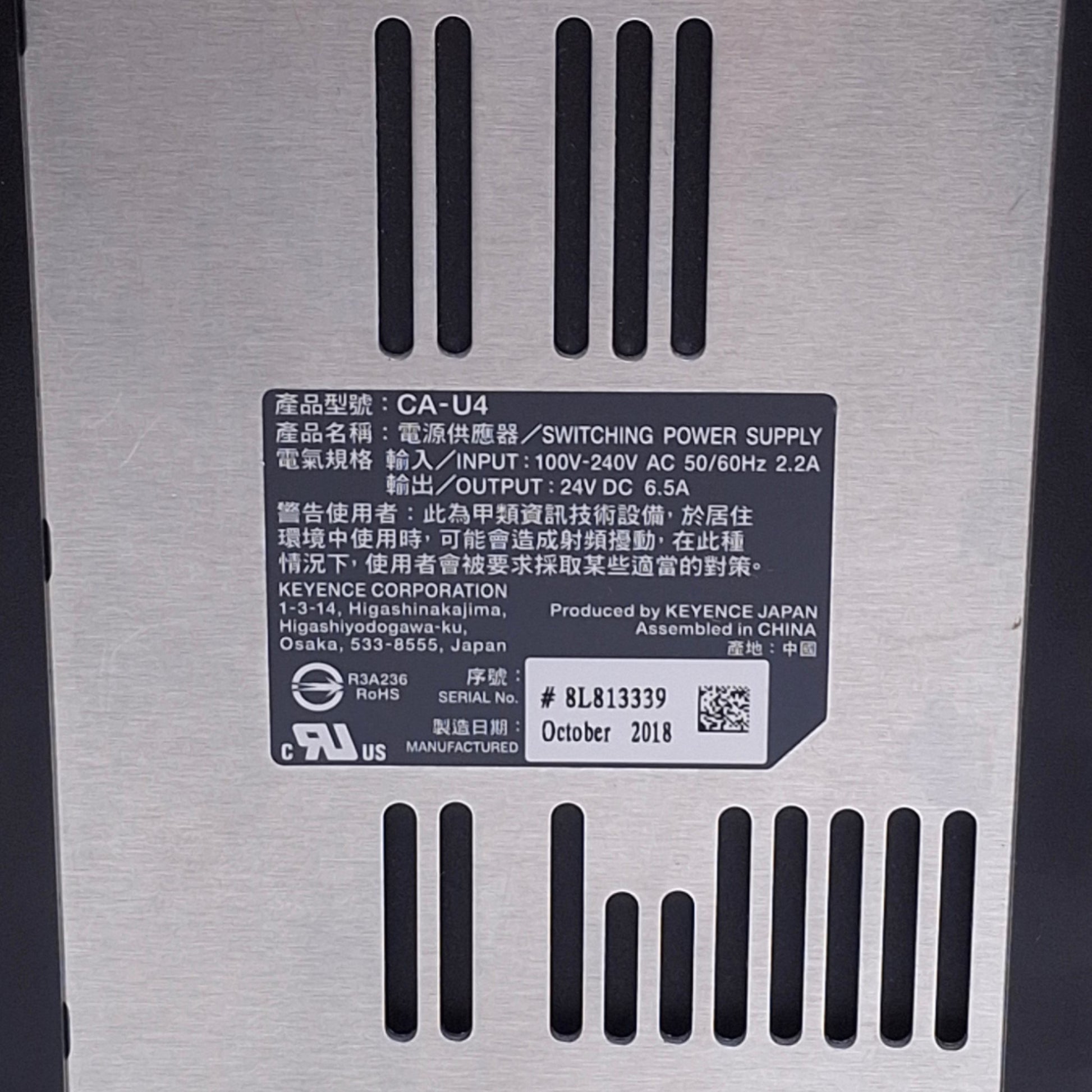 Used Keyence CA-U4 Vision System Power Supply Unit 100-240VAC In, 24VDC 6.5A Out