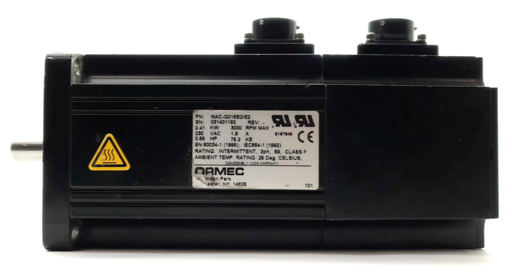 Used ORMEC MAC-G016B2/E2 Servo Motor, 230VAC 1.9A, 0.41kW, 3000RPM, 2000PPR, NEMA 34
