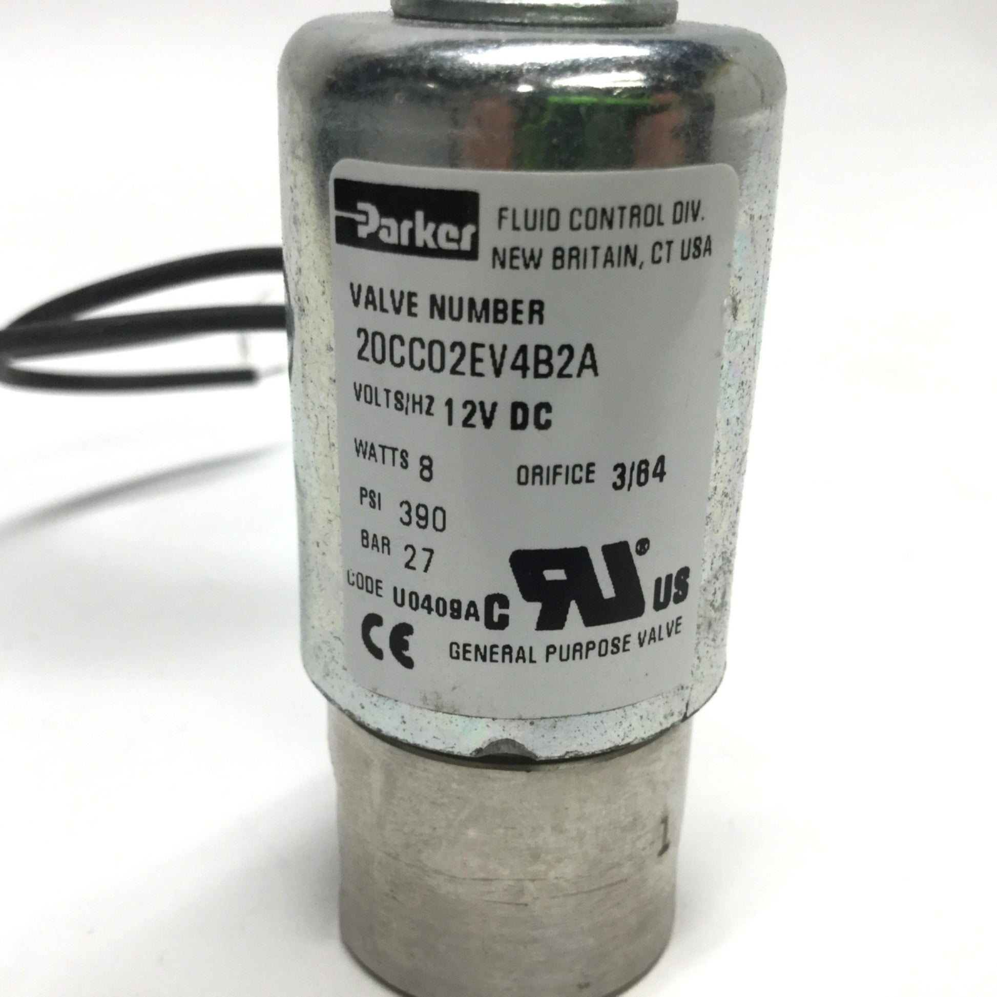 Used Parker 20CC02EV4B2A Solenoid Valve 2-Way NC, 12VDC, 1/8" NPT, 390psi