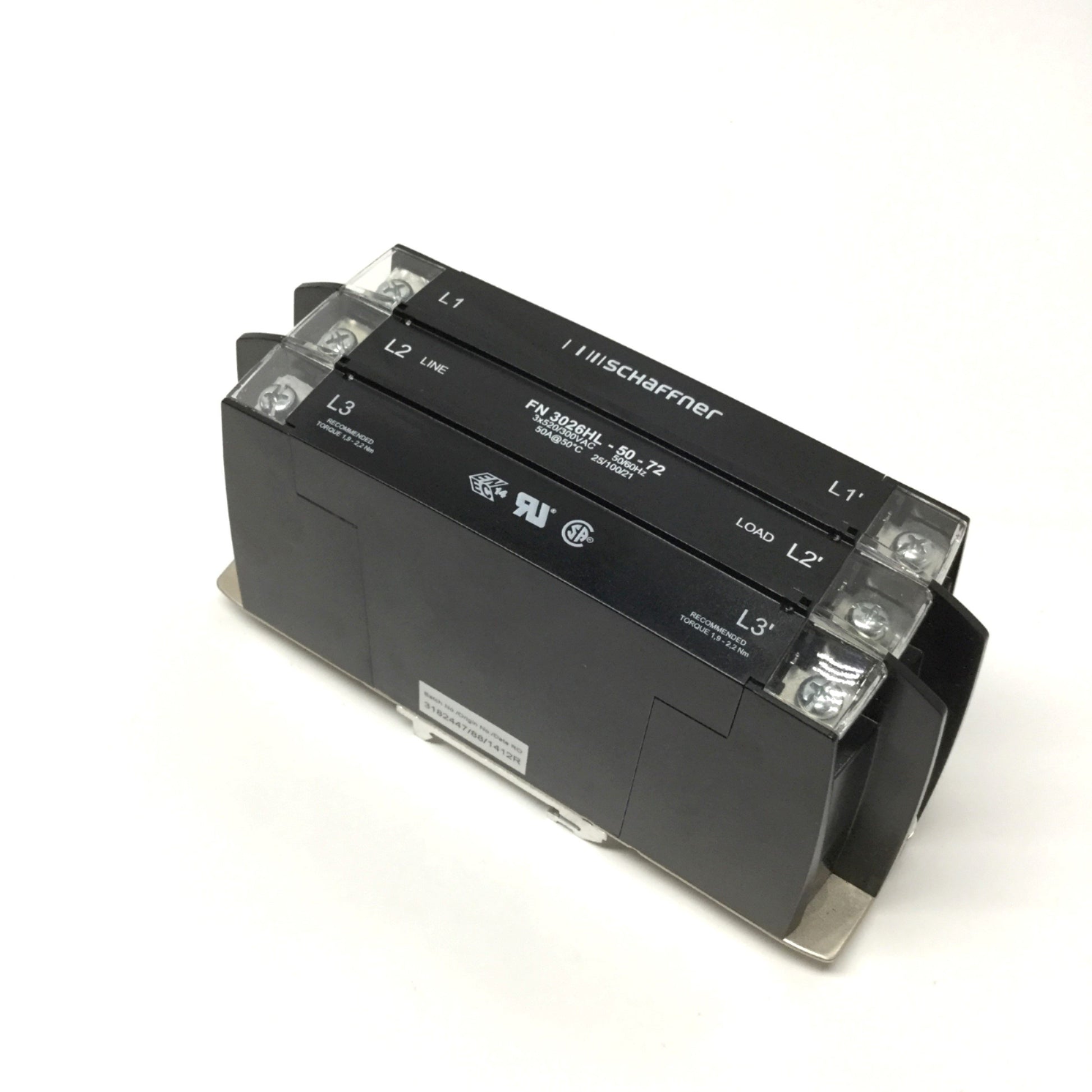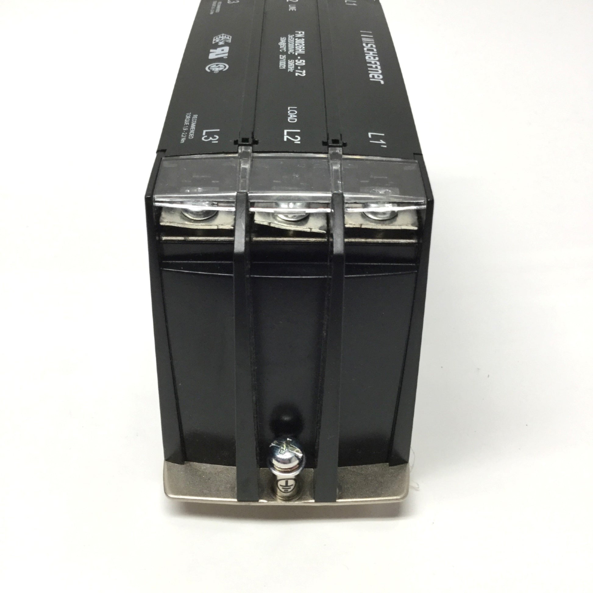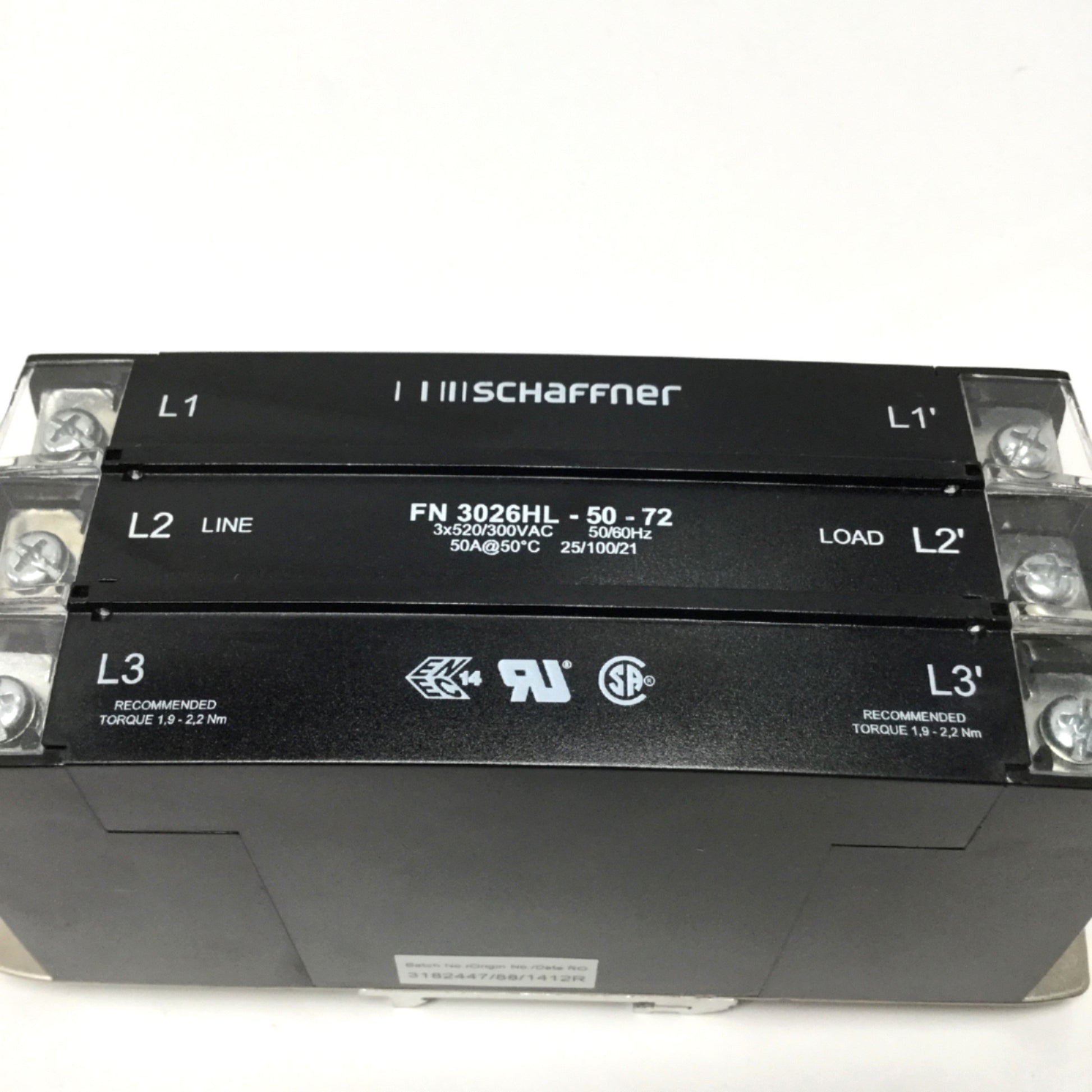 Used Schaffner FN 3026HL-50-72 Power Line EMC/RFI Filter 3-Phase 520/300VAC, 50A, DIN