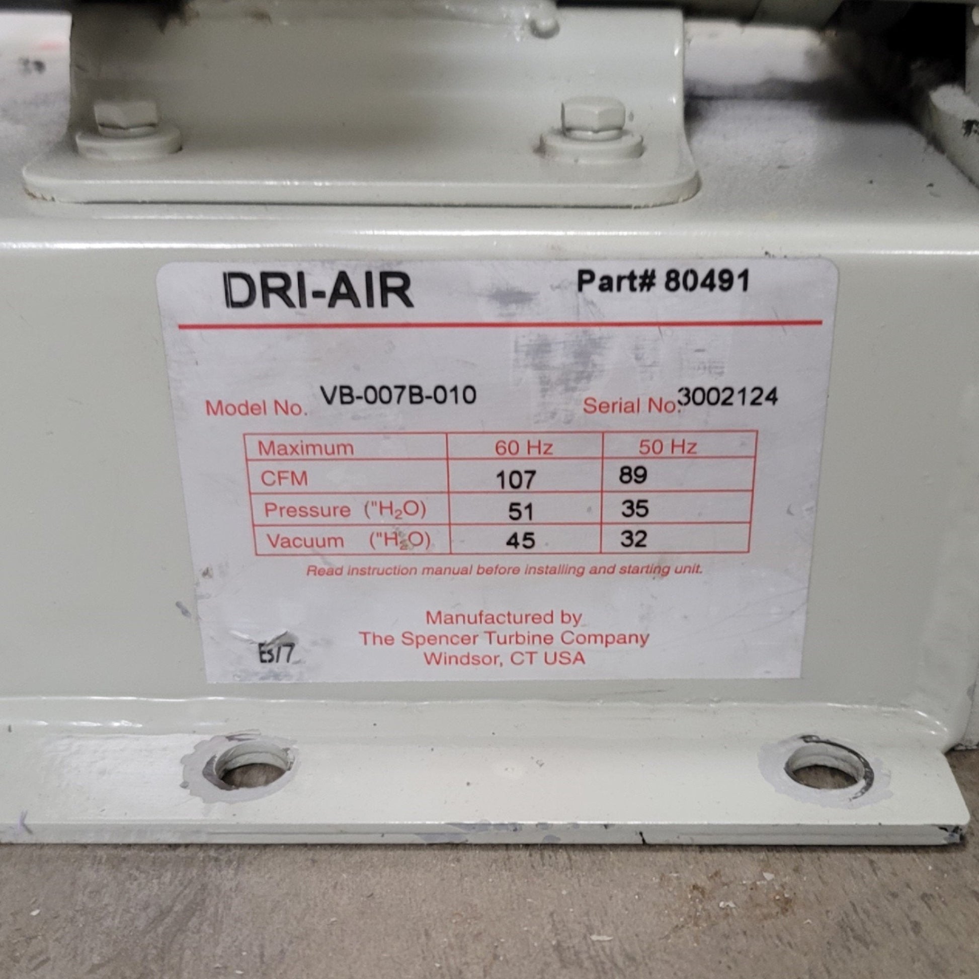 Used Spencer Turbine VB-007B-010 Vortex Regenerative Blower 107CFM, 200-230/460VAC