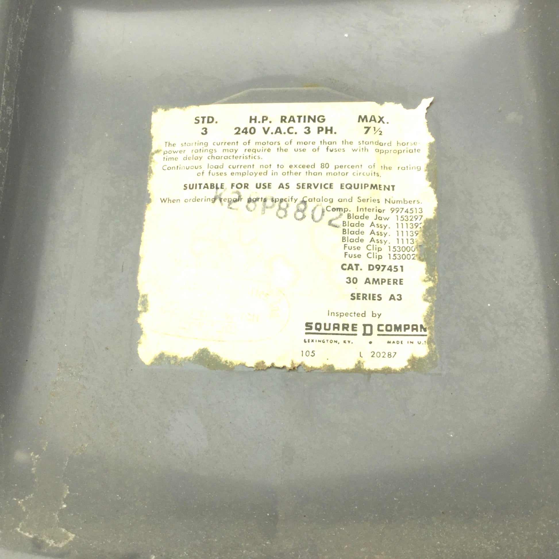 Used Square D D-97451 Safety Switch, 3 Phase, 30A, 240VAC Max, 3 HP, Series A3